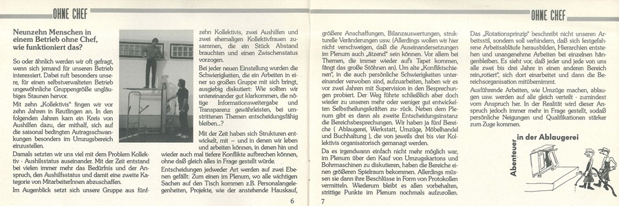 Okt. 81 Räume in Neckartenzlingen werden angemietet. In einer Anzeige suchen sie Menschen, "die keine Chance oder keine Lust haben, ihre Arbeitskraft auf dem un-freien Arbeitsmarkt anzubieten und lieber selbstbestimmt im Kollektiv arbeiten möchten".